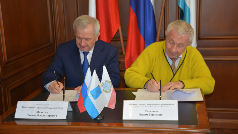 Сегодня в Саратовской городской думе прошла торжественная церемония подписания соглашения между представительным органом и специализированным учебно-научным центром (СУНЦ) Саратовского государственного университета имени Чернышевского и Института аграрных проблем РАН «Синергия науки и образования».