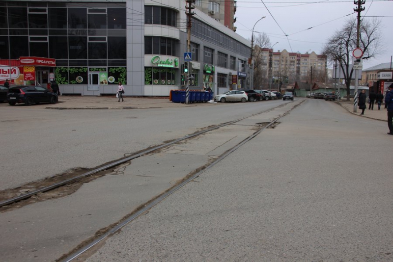 На улице Советской около Детского парка участники рейда проверили состояние асфальта вокруг трамвайных рельсов. Как оказалось, прямо посередине дороги образовались множественные ямы. Из-за этого машины значительно снижают скорость и очень медленно преодолевают перекресток, сразу образовываются пробки.
