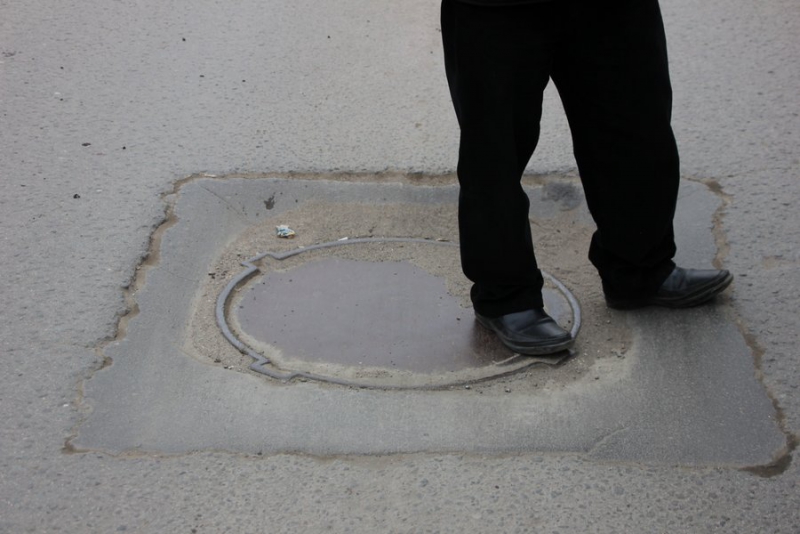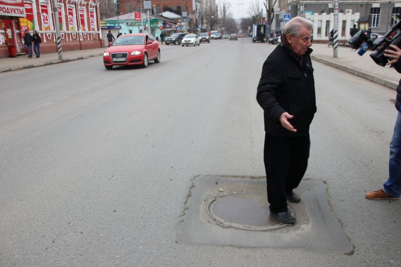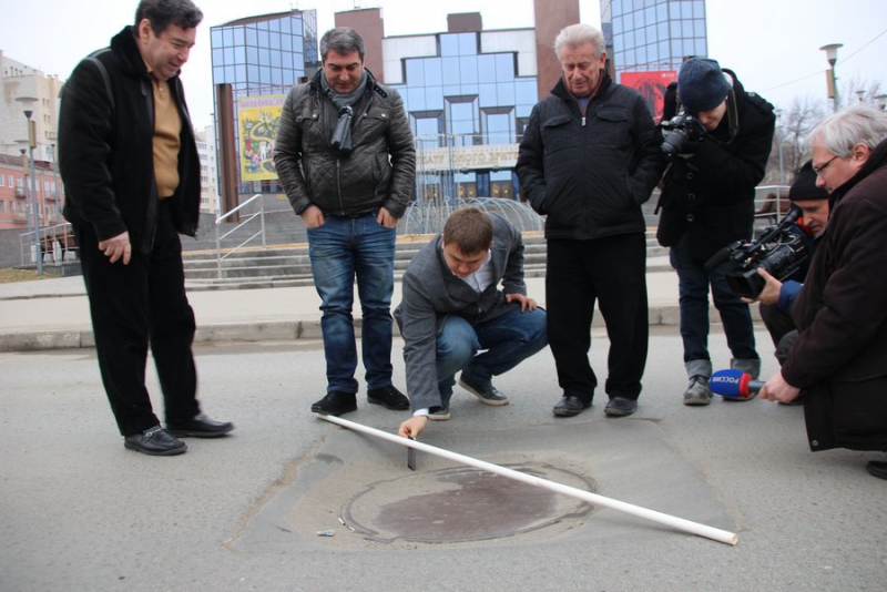 На Чапаева напротив ТЮЗа провалился люк. Причем, заметно, что его уже пытались ремонтировать. Александр Ландо встал в этот провал, чтобы лично продемонстрировать, насколько он глубокий.