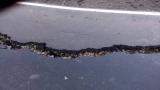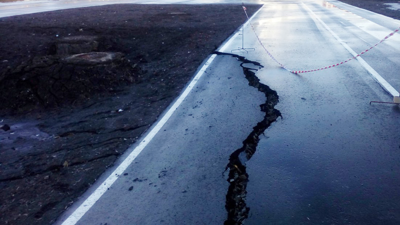 Свое сообщение он подкрепил фотографиями. На них видно, как на асфальтовом покрытии недалеко от центрального здания зияет глубокий разлом. Половина асфальта раскрошилась и завалилась набок. В разломе виднеется щебень.