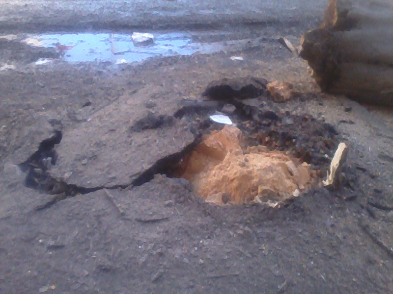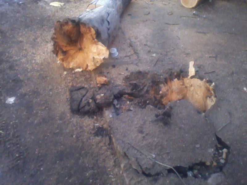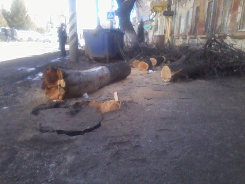 Дерево задело стену дома, сорвало ливневые отводы на крыше здания и повредило тротуарное покрытие. На данный момент ствол дерева распилен и лежит на тротуаре около дома. Около стены дома сложены ветки и обрушенная ливневка.