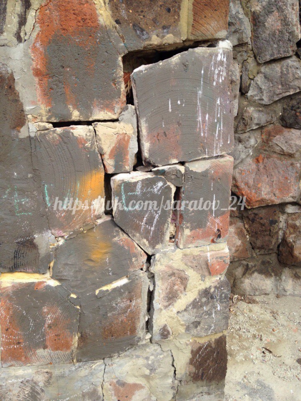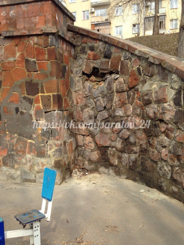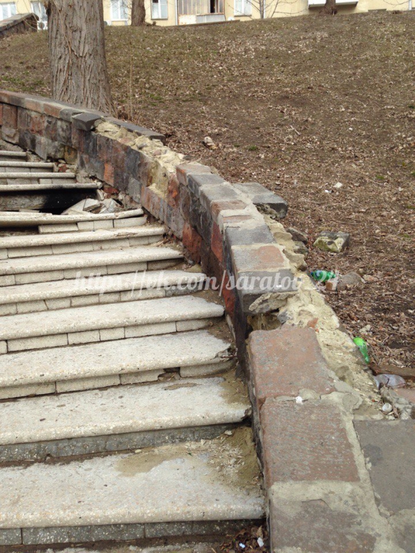 Судя по фотографиям очевидца, которые опубликованы в группе «Саратов онлайн» соцсети «ВКонтакте», сразу несколько ступеней уже обвалились. Причем между ними зияет широкая дыра. Как минимум две ступеньки наклонились настолько сильно, что гуляющим людям кажется, что вот-вот они провалятся.