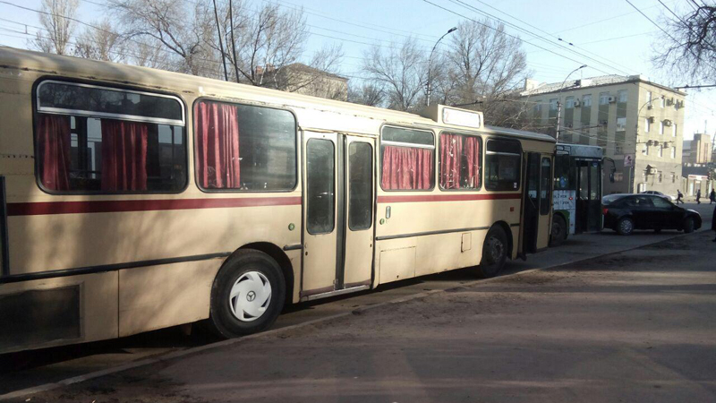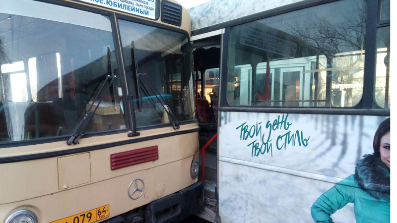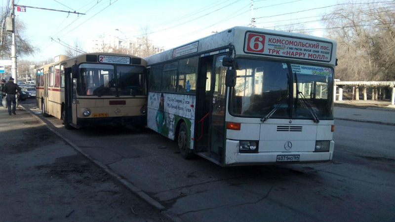 Сегодня утром в Саратове на улице Орджоникидзе в районе остановки 1-й Жилучасток произошло столкновение автобусов №2д и №6.