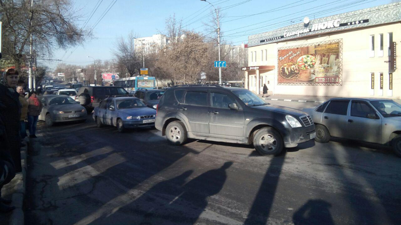 На дороге образовались большие пробки, на остановке столпилось множество горожан, которые не могут добраться до работы и, по словам корреспондента, «проклинают» водителей автобусов .
