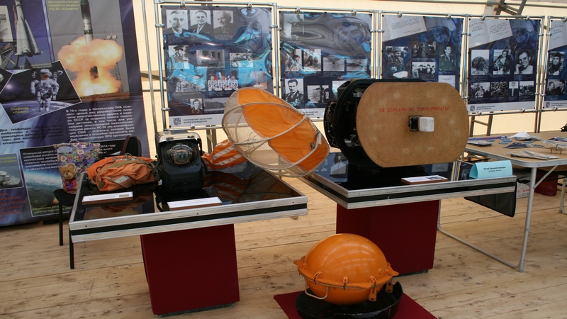 На площадке у Стелы развернулся большой выставочный павильон «Страна, покорившая космос» с участием музеев и предприятий Саратовской области. Здесь представлена выставка подлинных и копийных материалов и экспонатов о космосе.
