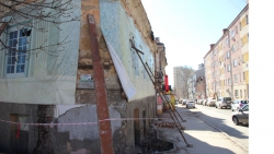 Как можно увидеть, в одном месте конструкция, прикрывающая разрушение, оторвалась. На доски близко к стене дома прикрепили ленту. Однако она расположена близко к стене дома и вряд ли может предостеречь прохожих от всех опасностей.