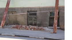 Обрушившаяся часть фасада под крышей со стороны улицы Соляной до сих пор не убрана и лежит в виде груды кирпичей и обломков на тротуаре. Также кладка может упасть еще как минимум в двух местах со стороны Чернышевского. В одном месте кирпич свисает над тротуаром. Из-за того, что фасад здания закрыт баннерами, оценить реальную степень разрушения дома затруднительно.
