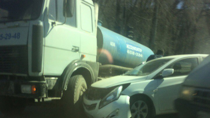 В районе 1-й Дачной иномарка врезалась в переднее колесо грузовика с цистерной. Легковой автомобиль получил незначительные технические повреждения. Из-за аварии оказались перекрыты две полосы дороги, из-за чего на Шехурдина образуются транспортные заторы.