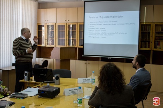 Доцент кафедры прикладной математики и информатики ССЭИ, к.э.н. Алексей Митрофанов посвятил свое выступление статистическому анализу опросов: методология с использованием статистического программного пакета Package R.