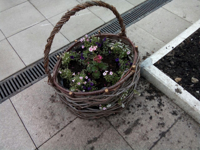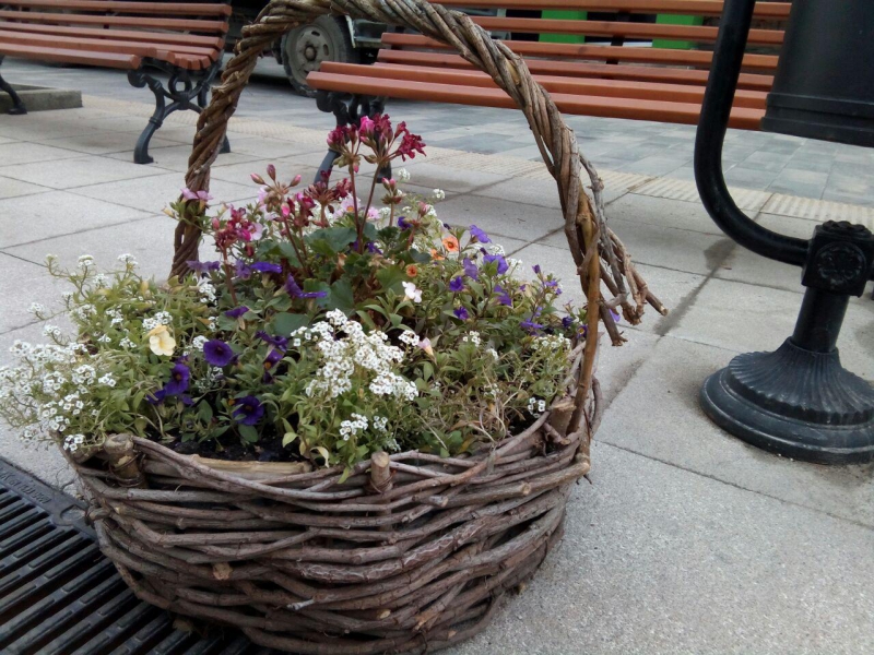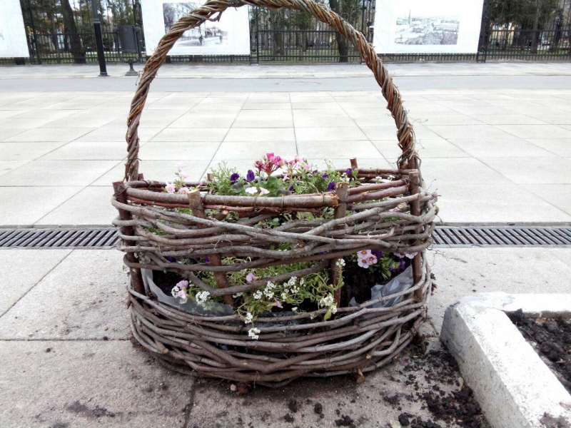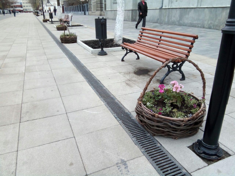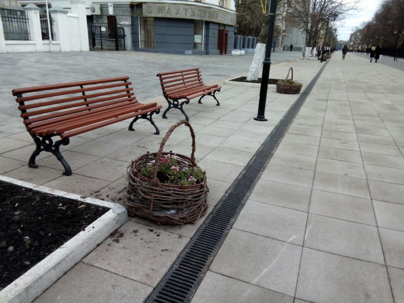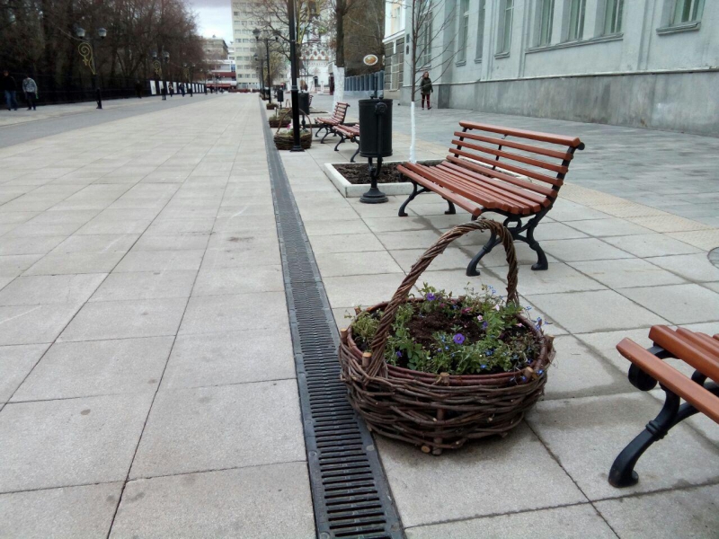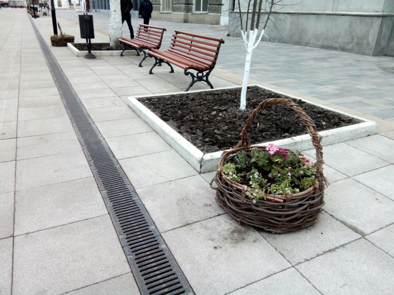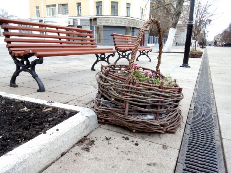 На сегодняшний день одна из корзин в самом начале улицы со стороны Радищева уже сломана. Из образовавшейся в основании клумбы прорехи рассыпалась земля. У еще одной корзины практически оторвана ручка.