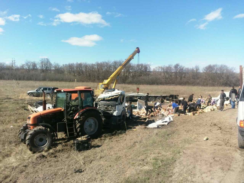 В Воскресенском районе Саратовской области мародеры растаскивают груз из перевернувшейся на трассе фуры.