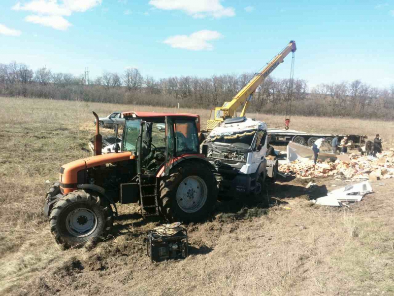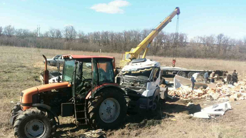 По словам очевидцев, большегруз вылетел на встречную полосу и опрокинулся в кювет. Полуприцеп от удара разорвало. По склону разлетелись коробки с соком.