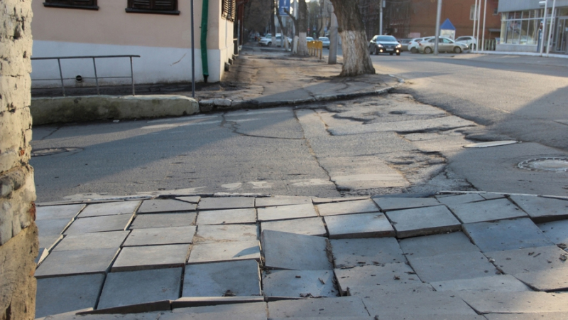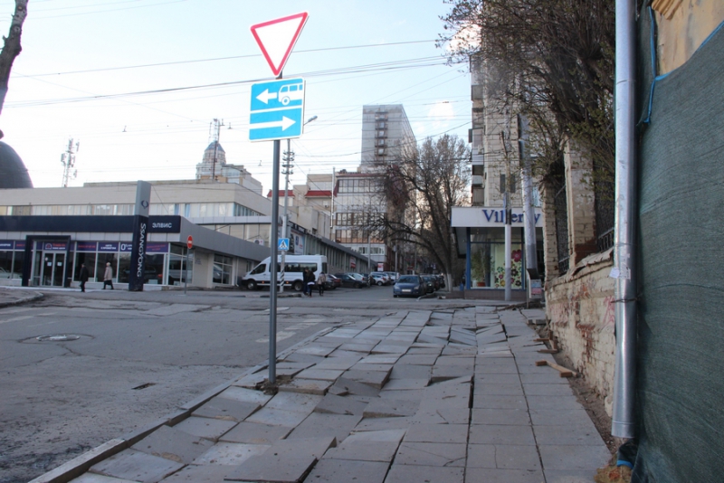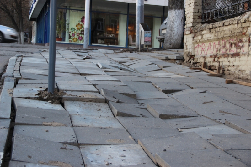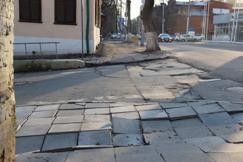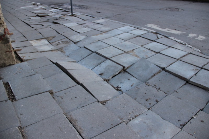 Широкие квадраты плитки в этом месте частично вздыбились, частично провалились. Это превратило тротуар в труднопроходимый участок. Пешеходы вынуждены обходить его по проезжей части, рискуя быть сбитыми автомобилями.