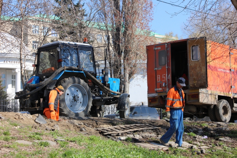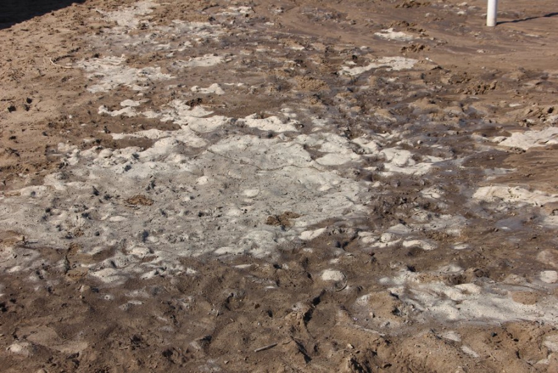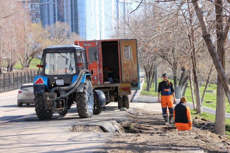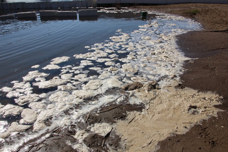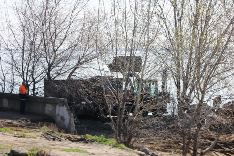 По мокрому асфальту видно, что вода стекает к Волге с улицы Набережная Космонавтов. Вполне возможно, что потоки образовались из-за коммунальщиков, которые ведут ремонтные работы в том районе, откачивают и сливают воду из колодца. На площадке видны два потока, которые спускаются прямо в реку, смывая по пути песок. Также на нем местами остаются белые пятна непонятного происхождения.