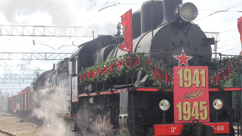 Ретро-поезд «Победа» сформирован из исторического подвижного состава времен Великой Отечественной войны. Поезд ведут два паровоза, один из которых принимал участие в Сталинградской битве. В составе: крытые товарные вагоны (теплушки), платформы (для перевозок военной техники), салон-вагон. Вся техника из экспозиции музея железнодорожной техники Северо-Кавказской железной дороги.
