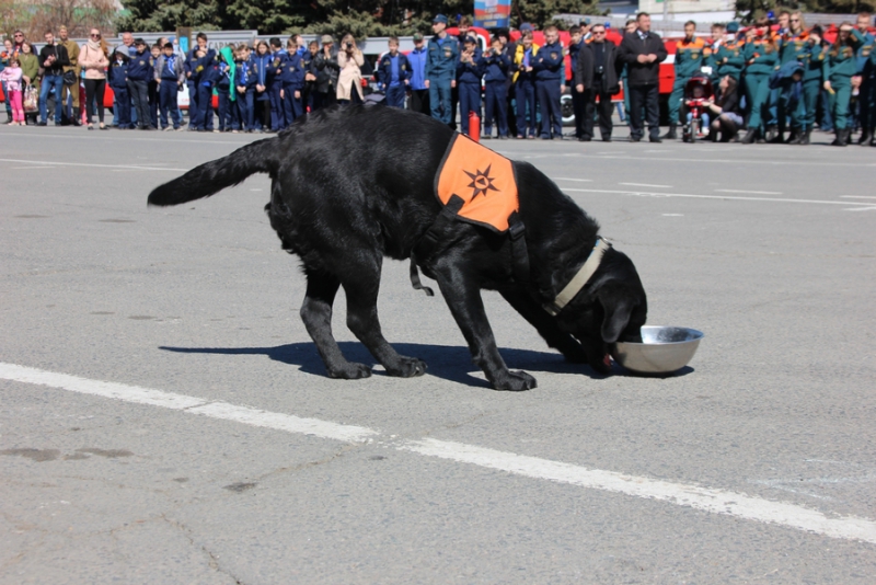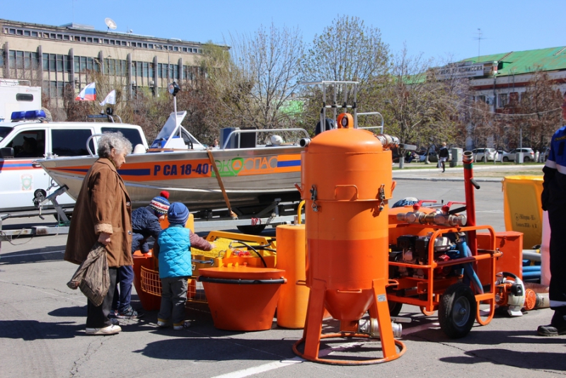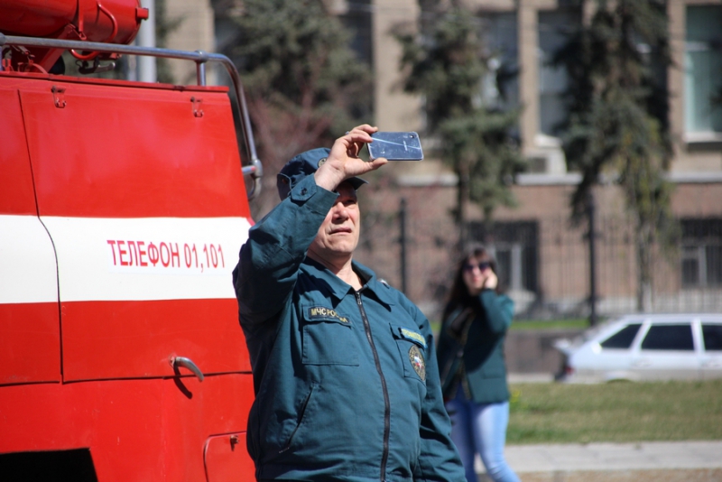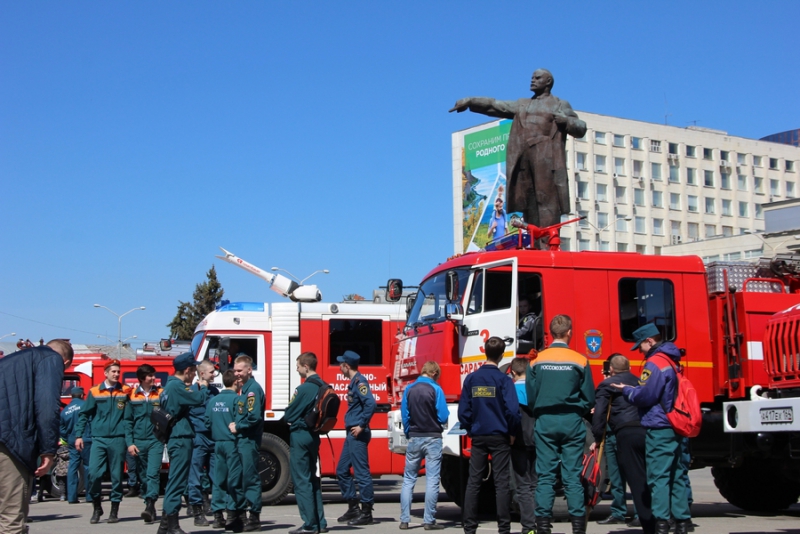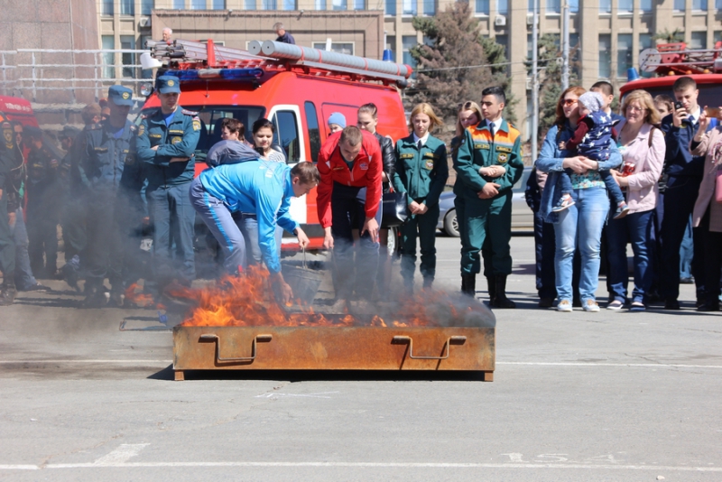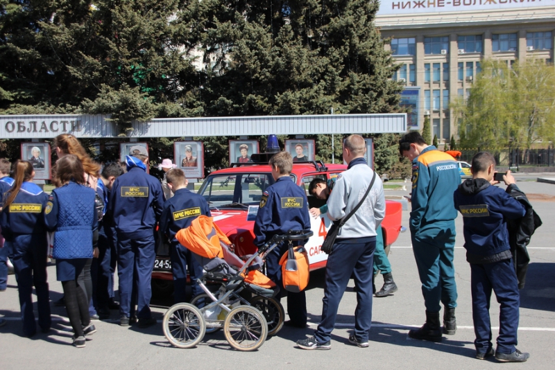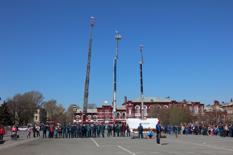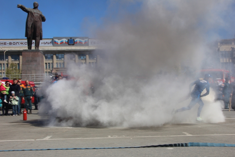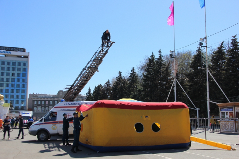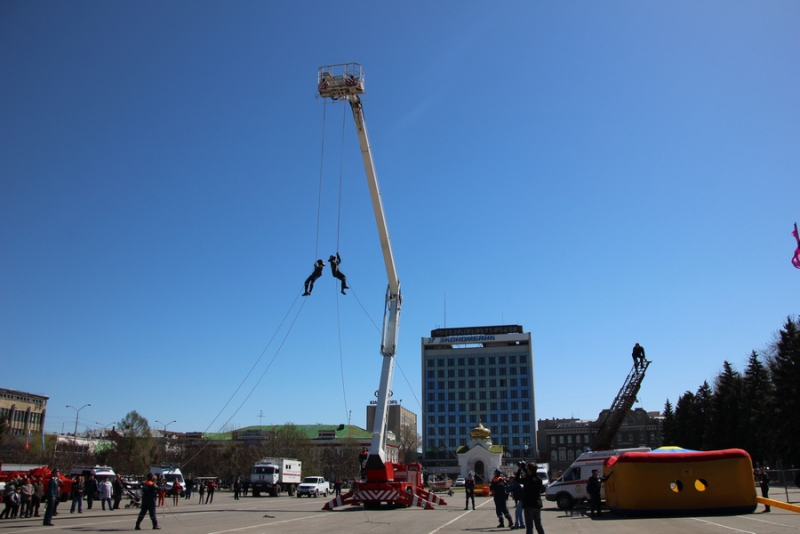 После прибытия на площадь прошли показательные выступления подразделений МЧС. В них участвовали кинологи, которые продемонстрировали умения собак, в том числе и убирать за собой миски. Пожарные спасали людей из условного пожара, был использован «куб жизни», который используют при пожарах, на него можно прыгать без вреда для здоровья с высоты нескольких этажей. Специалисты службы спасения продемонстрировали «самоспасение», когда 2 человека спускались по тросу с большой высоты с помощью специального оборудования. Молодые спасатели, победители многих конкурсов, продемонстрировали, как быстро развернуть пожарные рукава и потушить небольшой пожар.