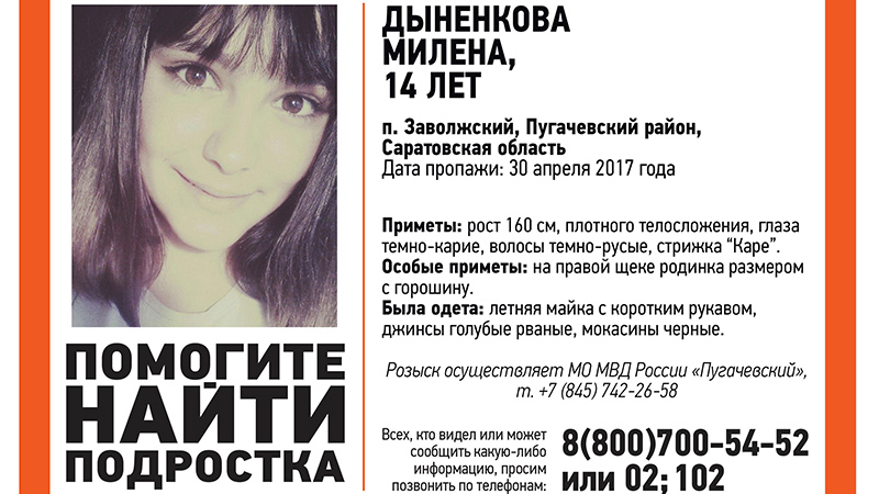 Всем, кому что-либо известно о местонахождении пропавшей, просьба позвонить по телефонам: 8 (84574) 2-26-58 (МО МВД «Пугачевский»), 8 (800) 700-54-52 («Лиза Алерт») или 02 (с сотового 102).