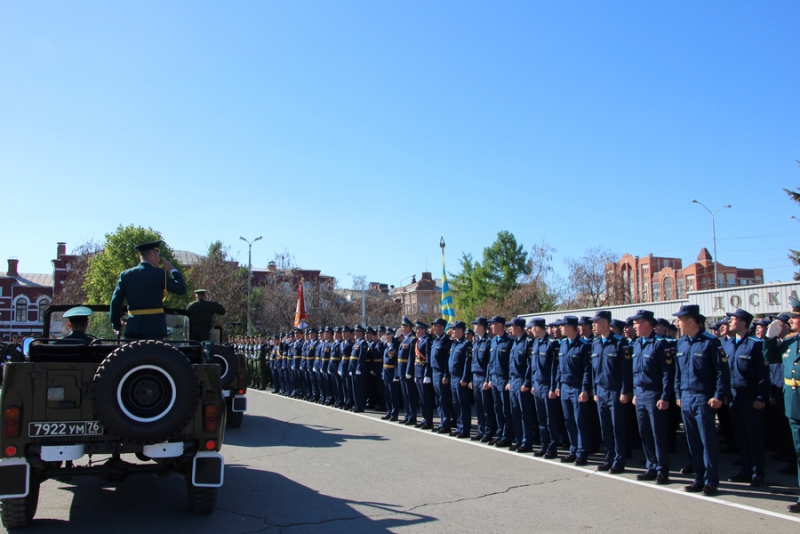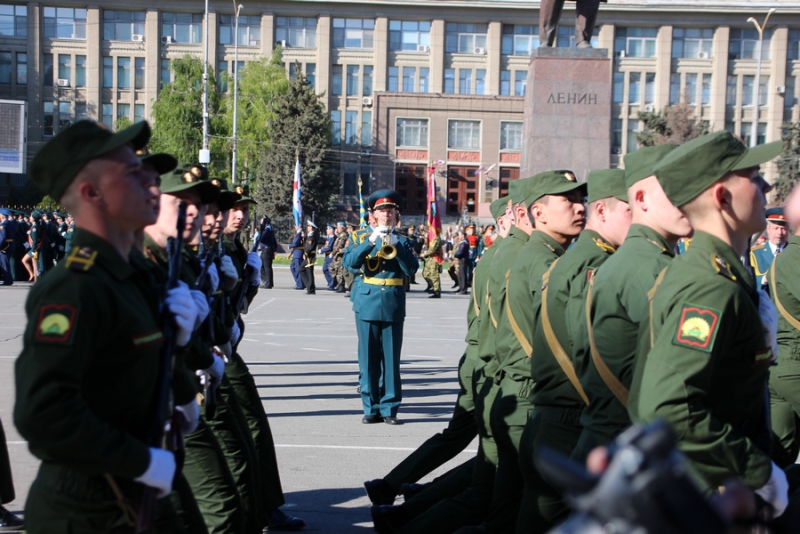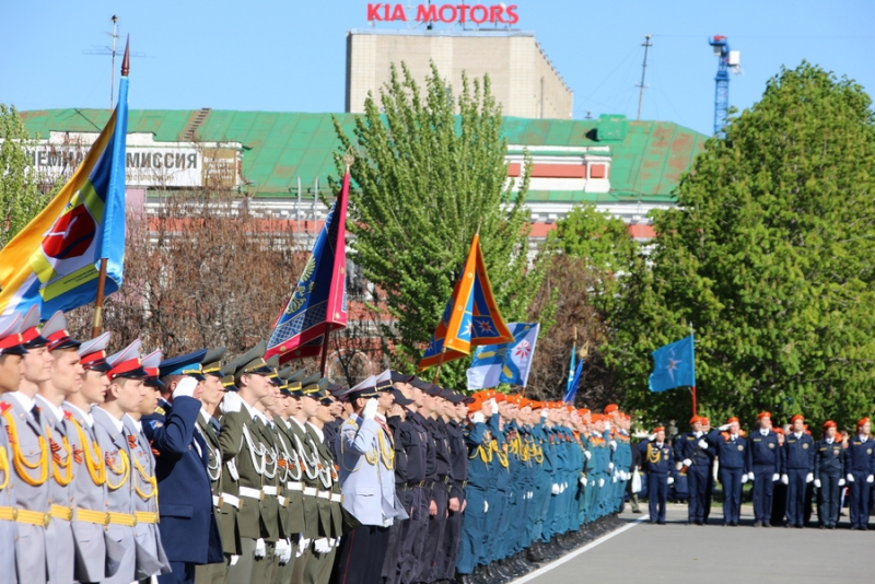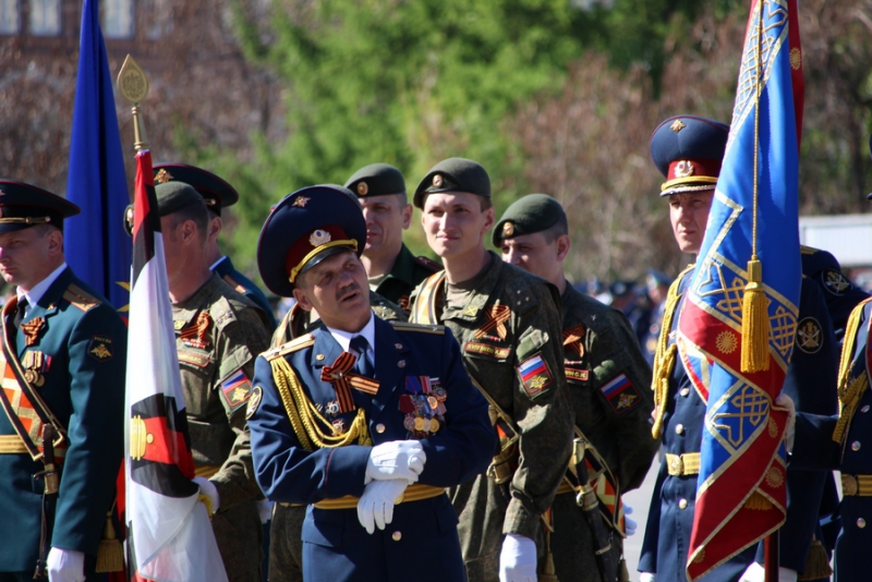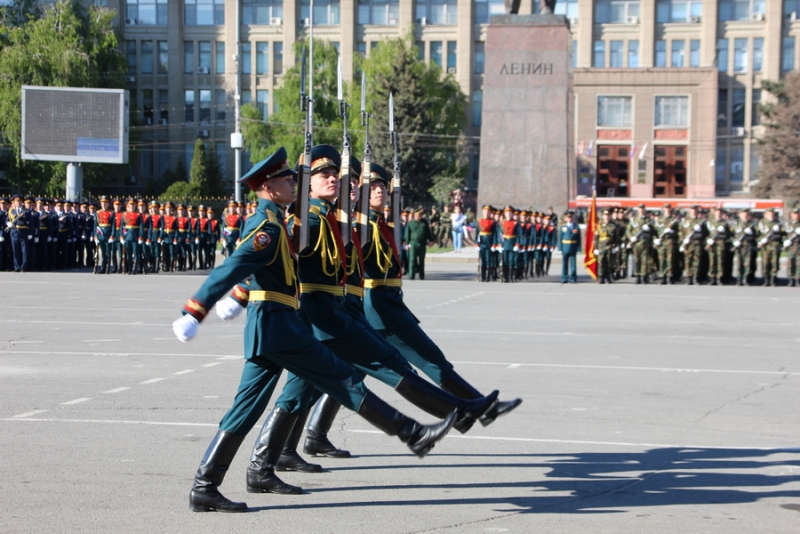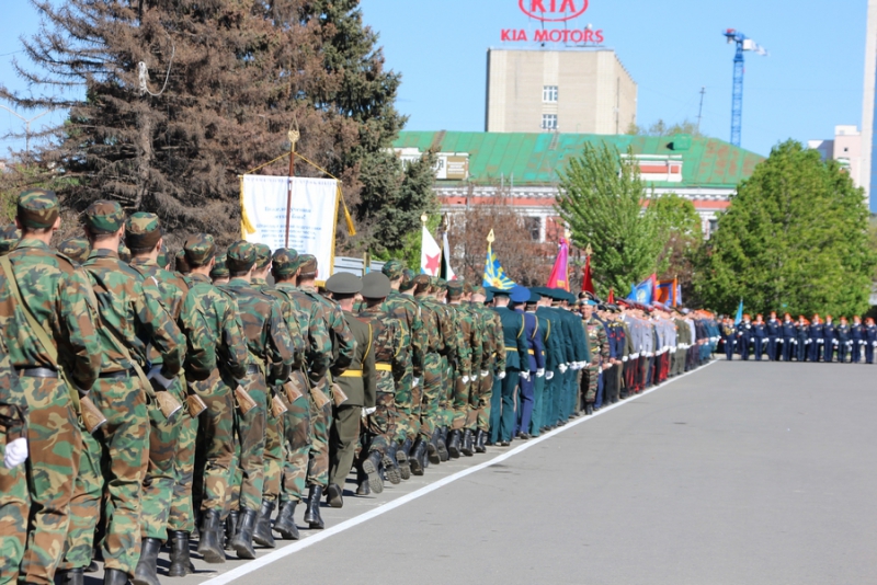 В центре города в колонны выстроились войска регионального гарнизона, ветеранские организации, учащиеся образовательных заведений, воспитанники кадетских классов, представители ОМОНа, ГУ МЧС - всего 28 колонн, в каждой около 80 человек.