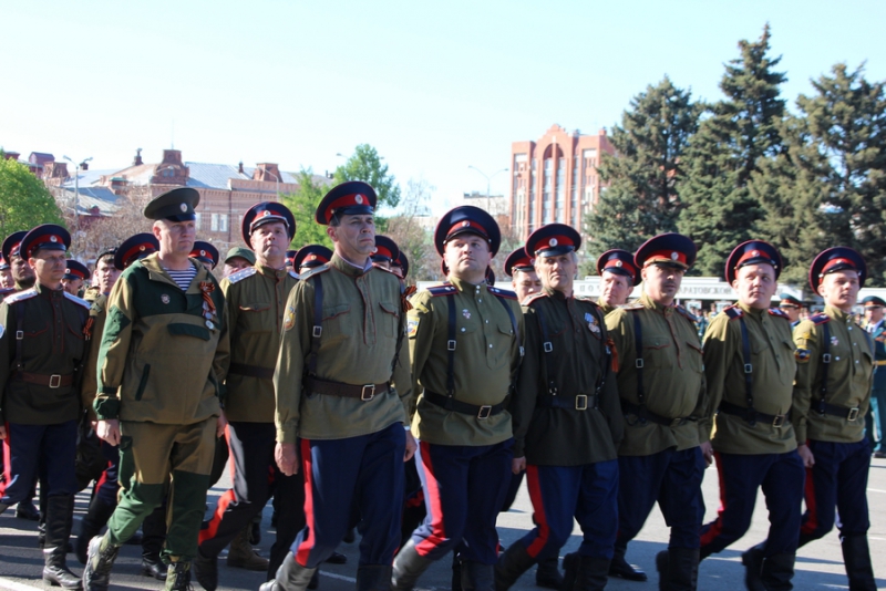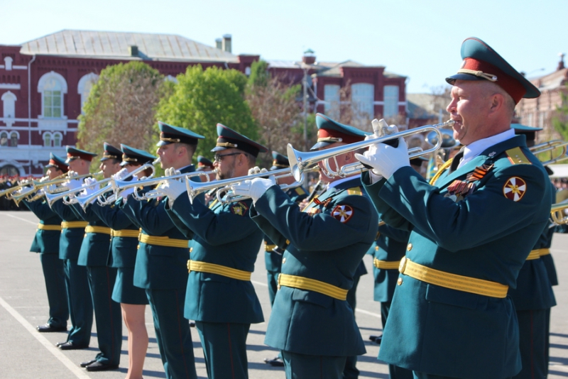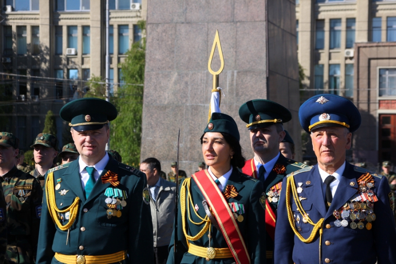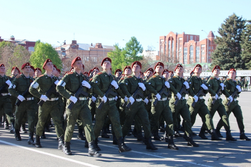 После этого парадные расчеты начали свое движение: каждый строй, проходя мимо сцены, делал равнение на право, и приветствовал высшее руководство. У многих из участников падали пилотки во время движения, кто-то из девушек даже потерял обувь, но эти мелочи не остановили их, и колонны ровным строем двигались дальше. В конце выступил сводный оркестр Саратовского гарнизона. Завершили парад показательные выступления Вольского гарнизона.
