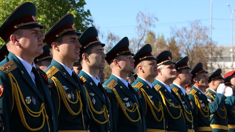 Перед началом репетиции начальник Саратовского военного гарнизона Валерий Мишнев дал указания знаменосцам и строевыем, после чего те вернулись к своим колоннам и передали поручения.