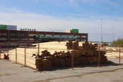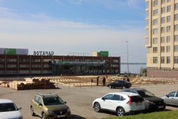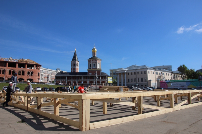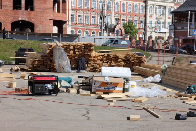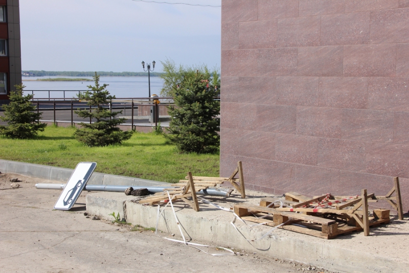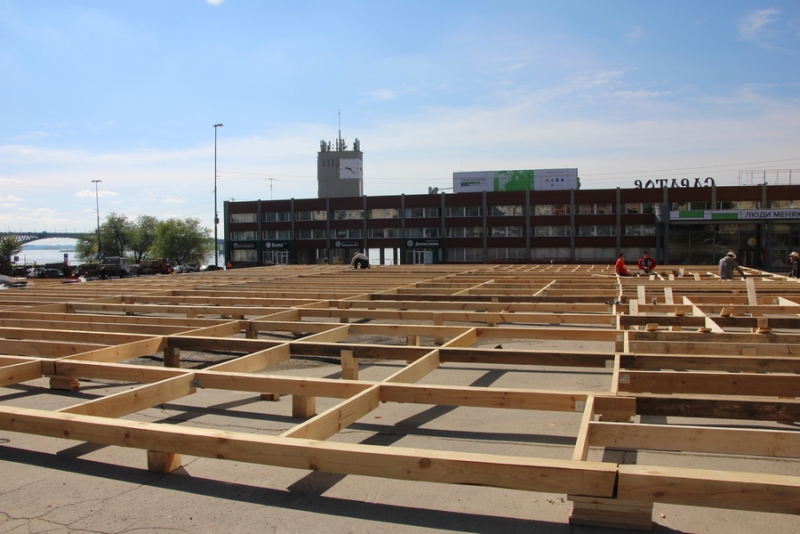 Территория перед бывшим речным вокзалом огорожена забором, и рабочие монтируют основание. Сейчас на площадке лишь деревянные брусья. Других строительных материалов не замечено, что именно будет представлять из себя выставка, тоже пока не понятно. Никаких информационных стендов рядом нет.