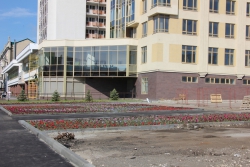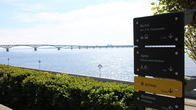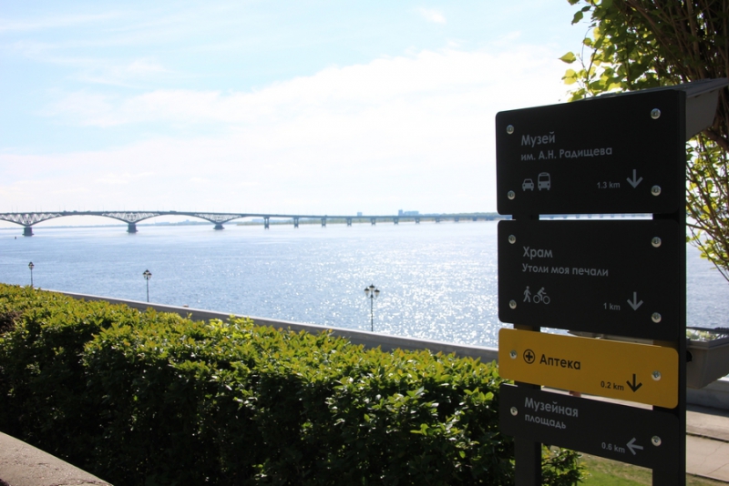 На выходных рабочие вместо снятой плитки уложили новый асфальт и разбили большие клумбы с цветами. Въезд на площадку перед Речвокзалом перегорожен вазонами. Также продолжаются работы по благоустройству Набережной Космонавтов. Вероятно, специально для гостей города появились информационные таблички, на которых стрелками указаны направление и расстояние до основных достопримечательностей Саратова: храмов, музеев и площадей.