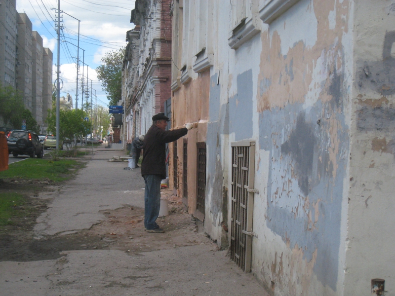 Двое пожилых мужчин орудовали кистями у домов на четной стороне улицы. На вопрос, будут ли ремонтировать фасады, один из них ответил, что нет. «Я понимаю, что так не делается. Но нам дали задание, мы его делаем», - сказал рабочий.