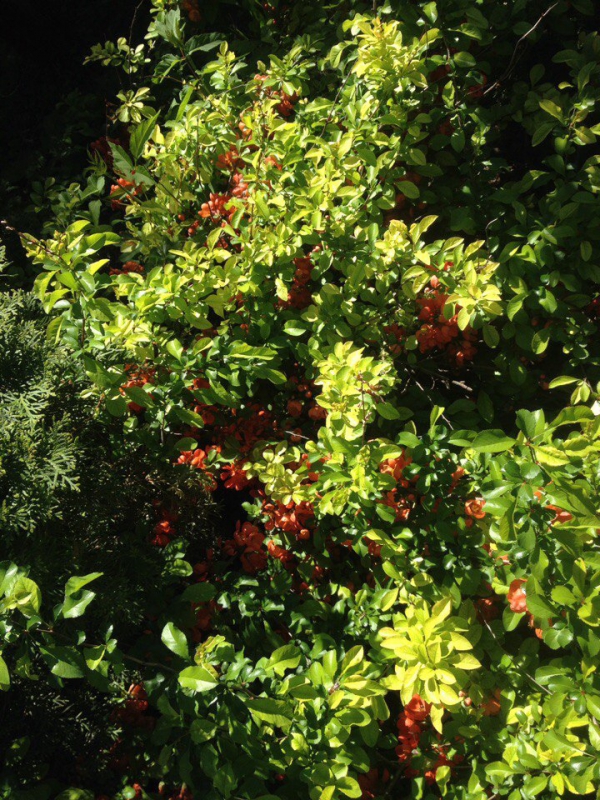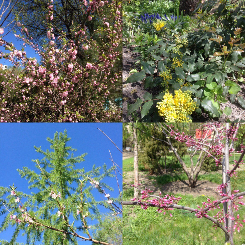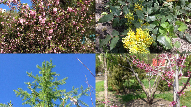Например, цветение наблюдалось у миндаля и персикового дерева. В настоящее время цветут японская керрия, несколько видов айвы, магония, церсис, дейция, рододендрон, лунария и др. Недавно появились еще несколько видов хвойных деревьев, а также ива сорта Хакуро Нишики, американский дерен, пузыреплодник и т.д.