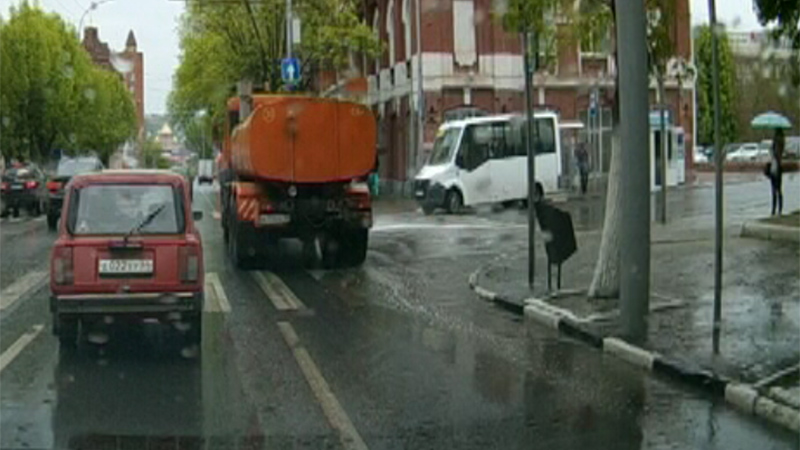 Один из водителей запечатлел с помощью видеорегистратора, как на улице Максима Горького, в районе Театральной площади, поливальная машина очищает дорогу струей воды. При этом отчетливо видно, что проезжая часть и так уже мокрая вследствие выпавшего дождя. Более того, от этой воды, судя по кадрам на видеоролике, создаются лужи на пешеходных переходах.