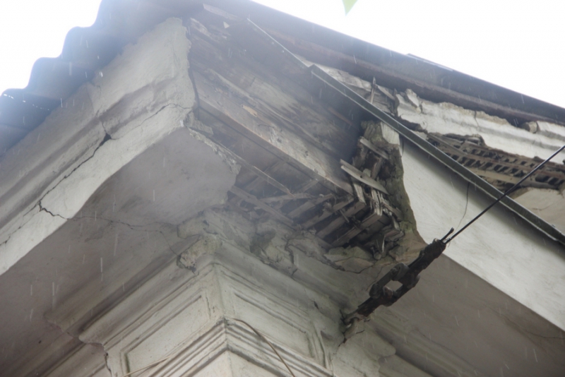 По всей видимости, лепнина обвалилась недавно, и ее разрушение может быть связано с дождем. Фасад дома ничем не огорожен. Какие-либо ремонтные работы в этом месте также не ведутся.