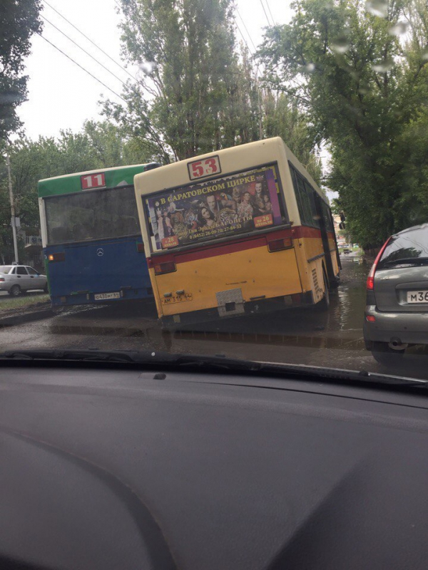 Сегодня в Ленинском районе Саратова в вымоину на дороге угодили два автобуса «Мерседес». Информация об этом распространяется в социальных сетях.