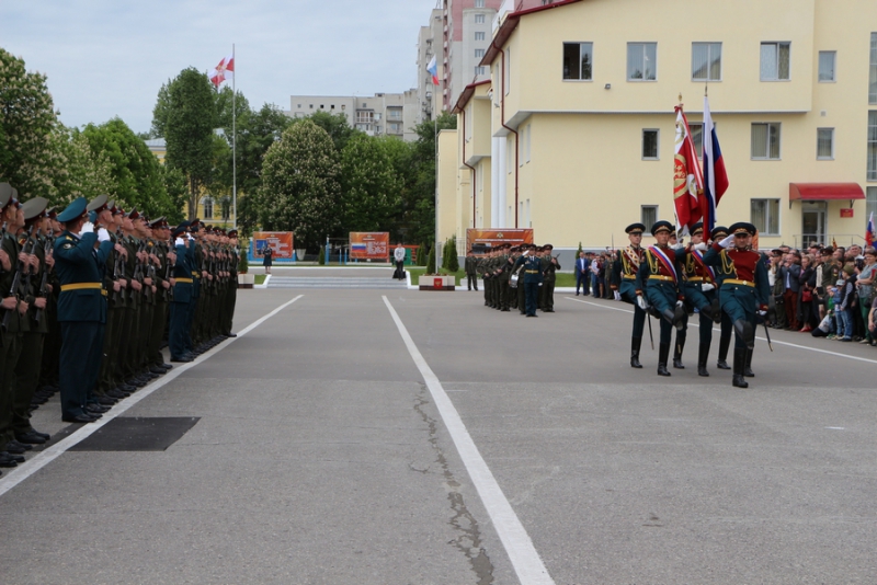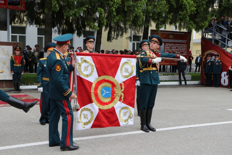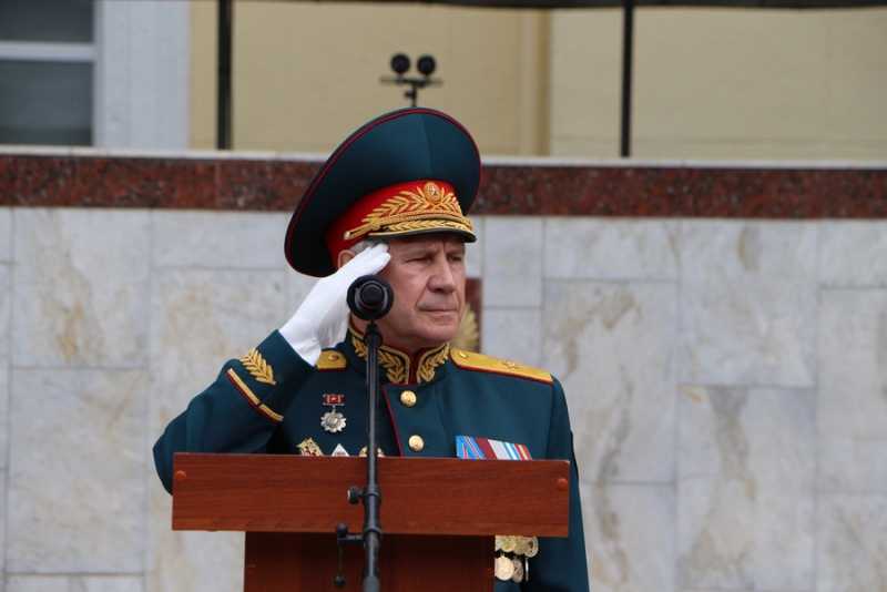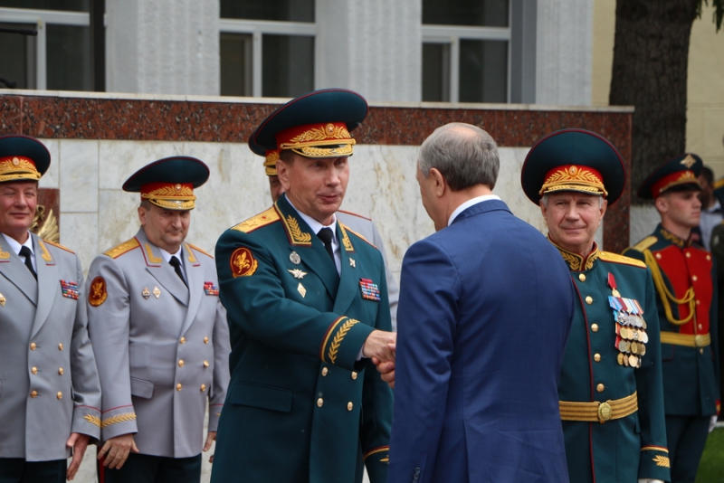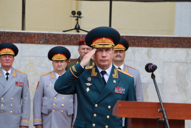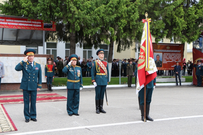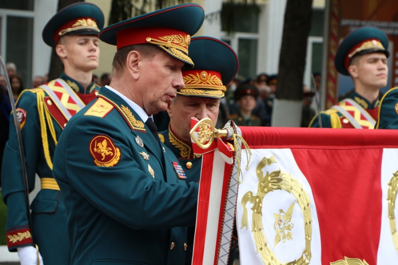 Началась церемония с построения личного состава института и выноса знамени. После чего начальник института Сергей Мухоед принял от Золотова орден имени Жукова, которого удостоился военный вуз указом президента РФ. Его прикрепили на знамя института.