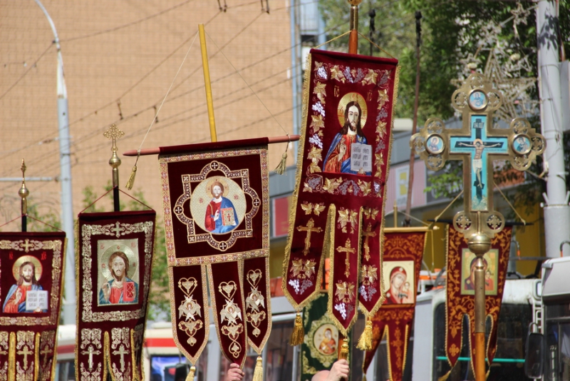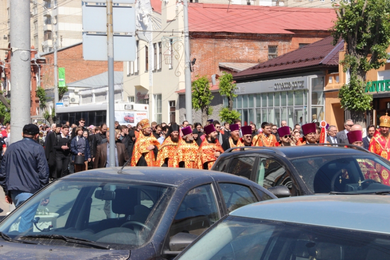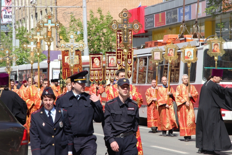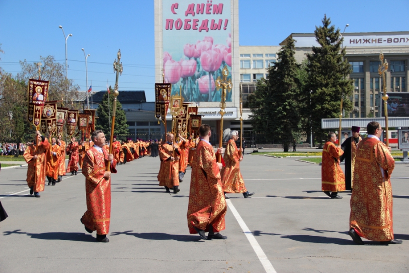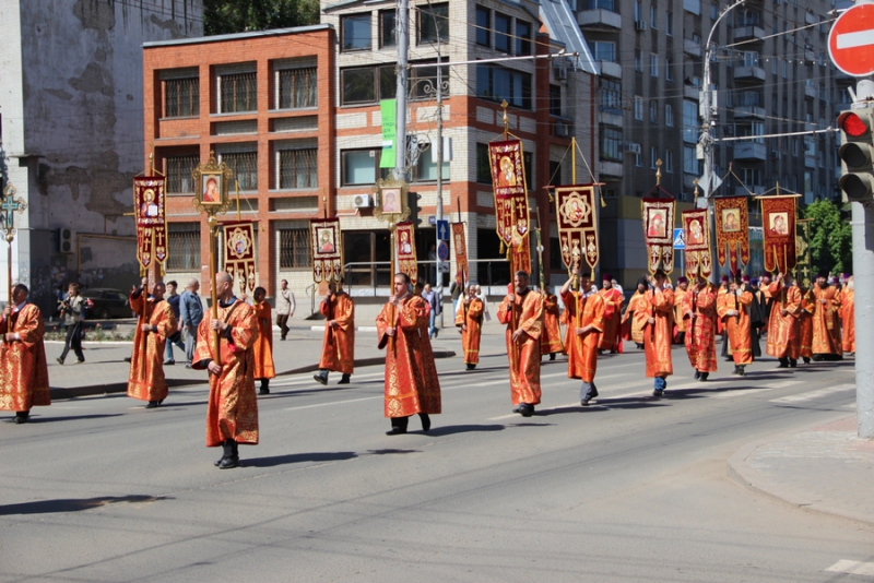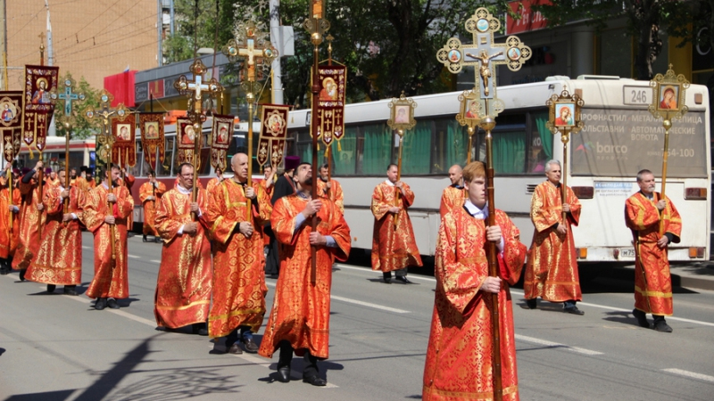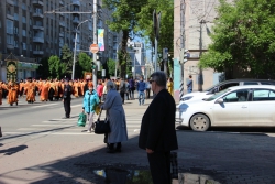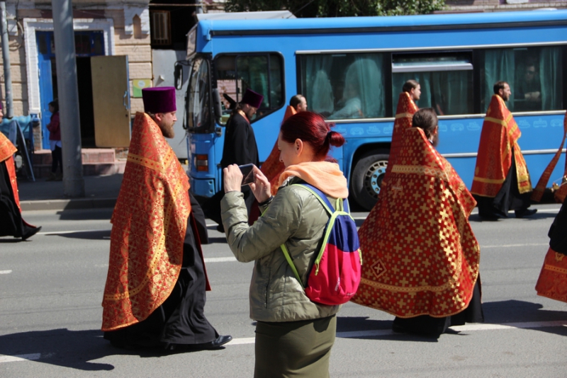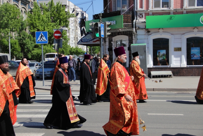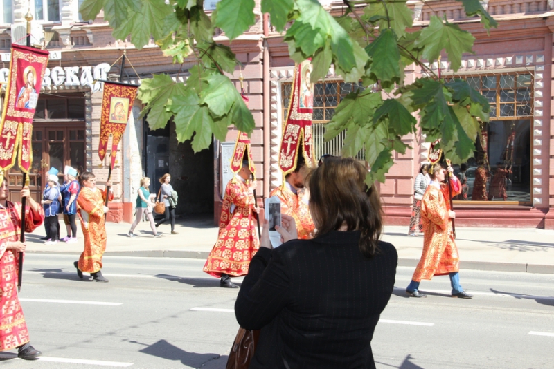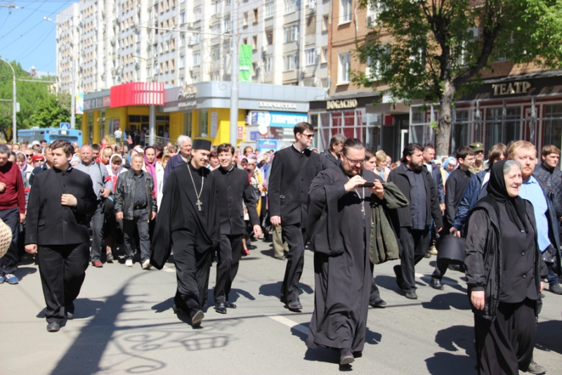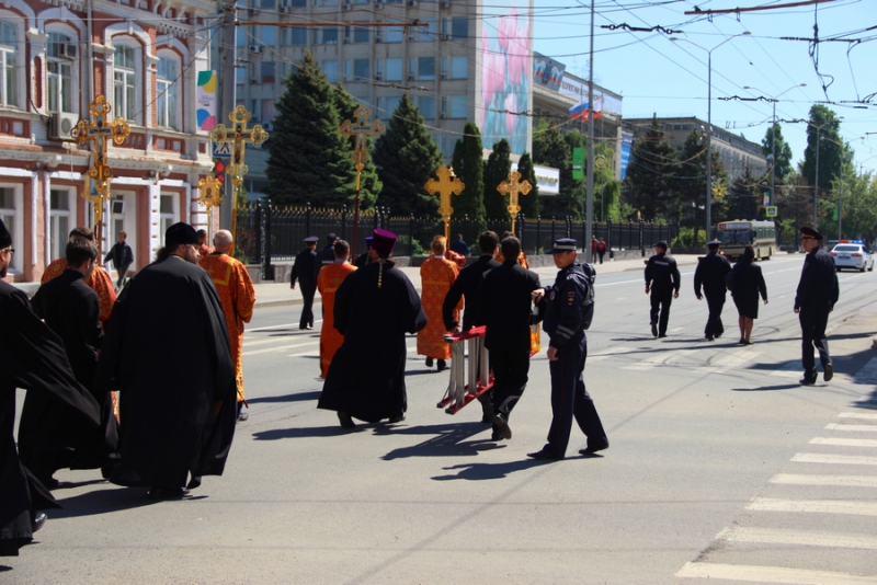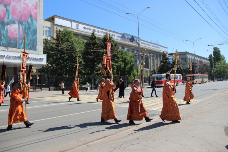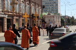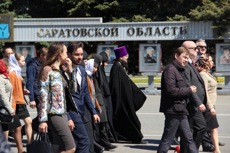 Сегодня, в день памяти равноапостольных Мефодия и Кирилла, в Саратове прошел традиционный крестный ход. Он начался от Кирилло-Мефодиевского храма при СГУ и растянулся до Театральной площади. Основная часть мероприятия проходила через улицу Московскую. Во время шествия священнослужители исполняли пасхальные песнопения и воклицали «Христос Воскресе!». «Во истину воскресе!» - отвечали им прохожие, находившиеся в это время на тротуарах по обеим сторонам от процессии. Они также фотографировали процессию на сотовые телефоны и фотоаппараты.