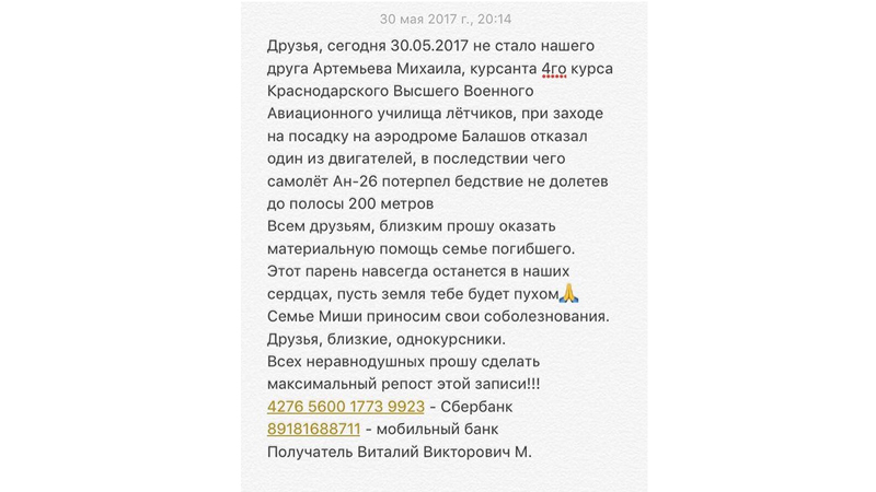 «Друзья, сегодня, 30.05.2017, не стало нашего друга Артемьева Михаила, курсанта 4го курса Краснодарского Высшего Военного Авиационного училища лётчиков. При заходе на посадку на аэродроме Балашов отказал один из двигателей, впоследствии чего самолёт Ан-26 потерпел бедствие, не долетев до полосы 200 метров. Всем друзьям, близким прошу оказать материальную помощь семье погибшего. Этот парень навсегда останется в наших сердцах, пусть земля тебе будет пухом. Семье Миши приносим свои соболезнования», - написал вчера инициатор поста Руслан Марсович.
