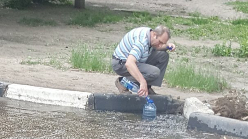 Так, на одной из фотографий женщина подставила ведро прямо под магистралью тепловых сетей. Сверху в емкость стекает вода. На другом фото мужчина разливает по пластиковым бутылкам воду, текущую по дороге вдоль тротуара.