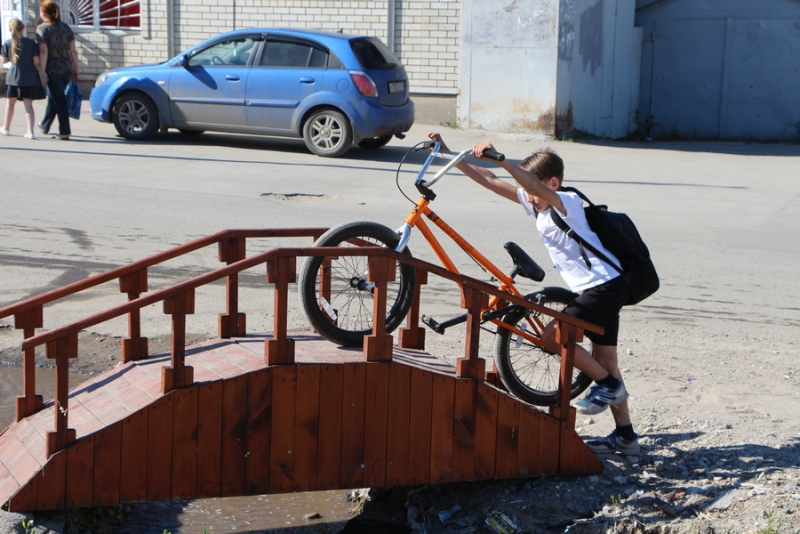 Сооружение совсем недавно водрузили над канавой, которая проходит вдоль трамвайных путей. «Речка» течет почти по всей улице, видимо из-за частых коммунальных аварий, поэтому мостик является, по сути, единственным способом перебраться на другую сторону. Однако его выпуклая форма доставляет некоторые неудобства для тех, кто перебирается по нему с велосипедом. Ширина мостика также не позволяет пройти по нему с детской коляской.