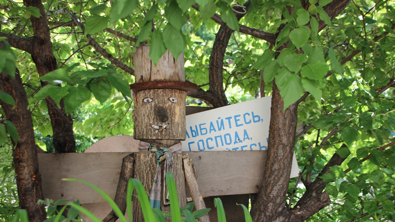 Однако почти все сказочные персонажи потеряли свой прежний вид. Краска облезла, деревянные бруски потрескались, и герои скорее пугают, чем развлекают детей, неожиданно обнаруживаясь в траве.