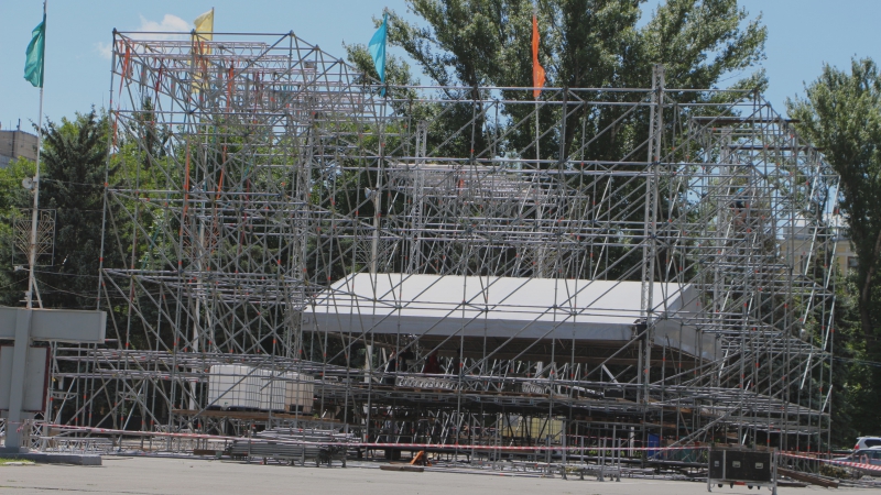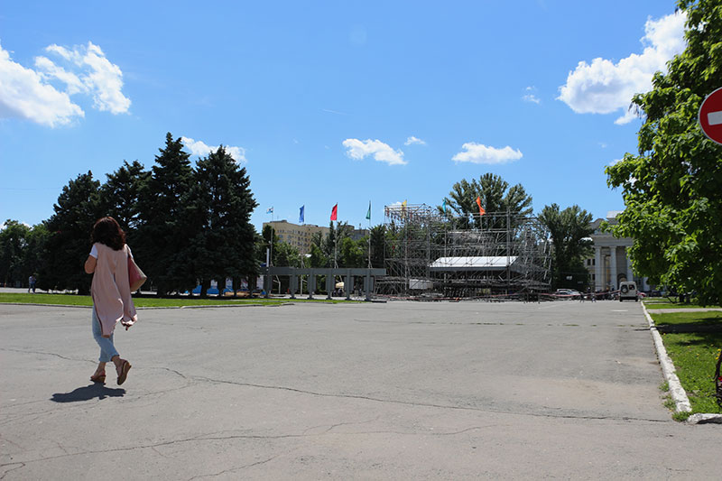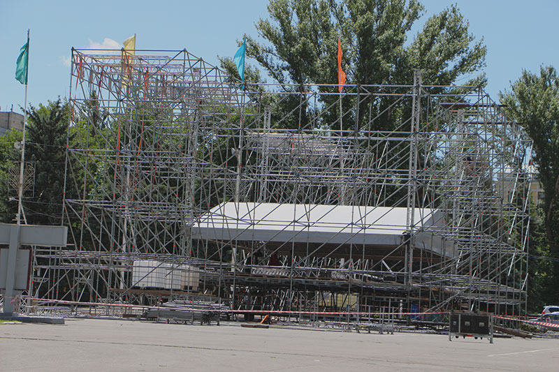 К этому моменту на площади возвели металлический каркас будущей сцены. По конструкции она будет такой же, как и в прошлом году. Тогда в центре временной сцены поместили огромный раздвижной экран, а по бокам было еще несколько задекорированных. По задумке организаторов, облик сооружения символизировал диаграмму розы ветров.