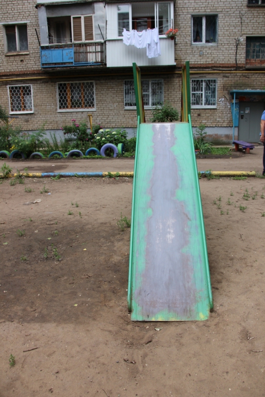 На улице Василевского общественников ждали две больших лужи рядом с детской площадкой, на которой были поломаны большинство снарядов.