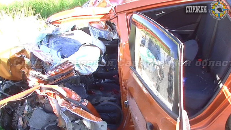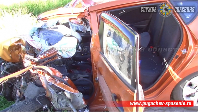 Спасатели из Пугачева с помощью гидравлического инструмента извлекли из покореженного «Соляриса» тело погибшей женщины. Водители грузовых автомобилей серьезных травм не получили.