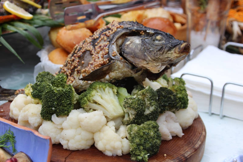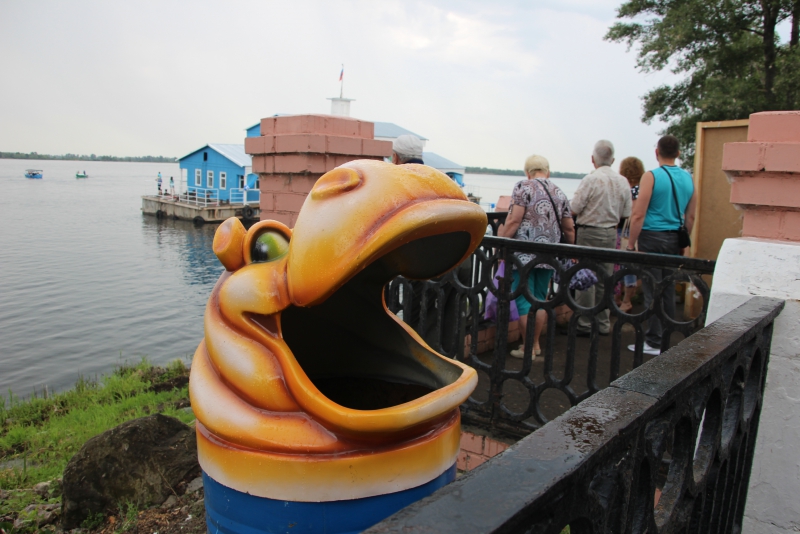 Набережную оставили для променада. На ней же разместили небольшую экспозицию работ таксидермиста. Время от времени экспонаты укутывали в черные полиэтиленовые пакеты от дождя. Полюбоваться на речных обитателей можно было только к концу фестиваля, когда погода разгулялась.