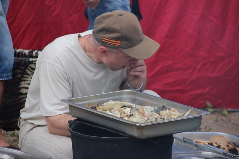 Но большинство, проходя мимо лотков, стремились попасть к Волге на набережную, там, где готовили и раздавали уху. Фестиваль состоялся на следующий день после нерестового запрета. Поэтому на вопрос, когда же вы успели столько рыбы наловить, ответ был примерно таким: «Всю эту ночь ловили».
