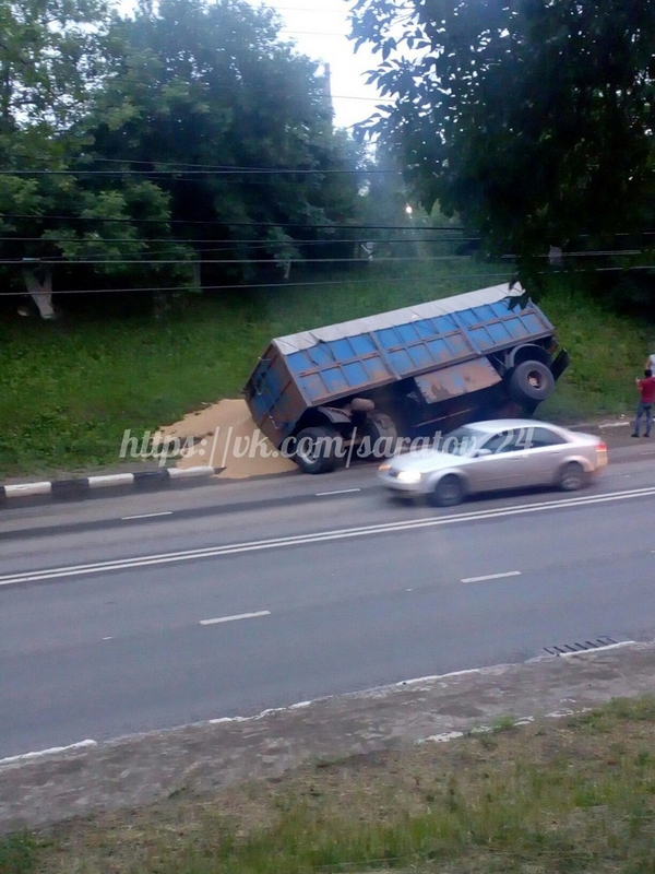 Вчера в Саратове на улице 2-я Прокатная в районе Трофимовского моста у грузовика отцепился прицеп с зерном. Как сообщили в соцсетях участники группы «Саратов онлайн», прицеп съехал на обочину и опрокинулся. При этом, как видно из опубликованных фотографий, из него высыпался груз.