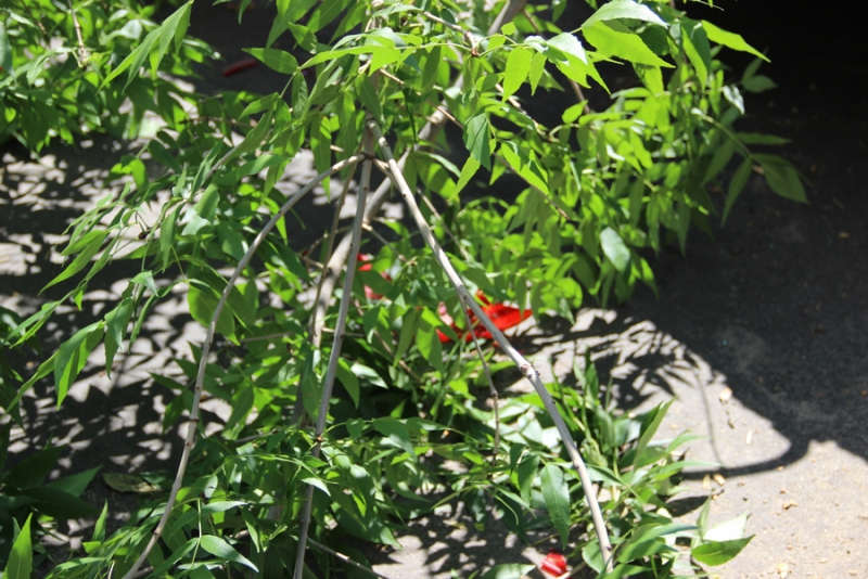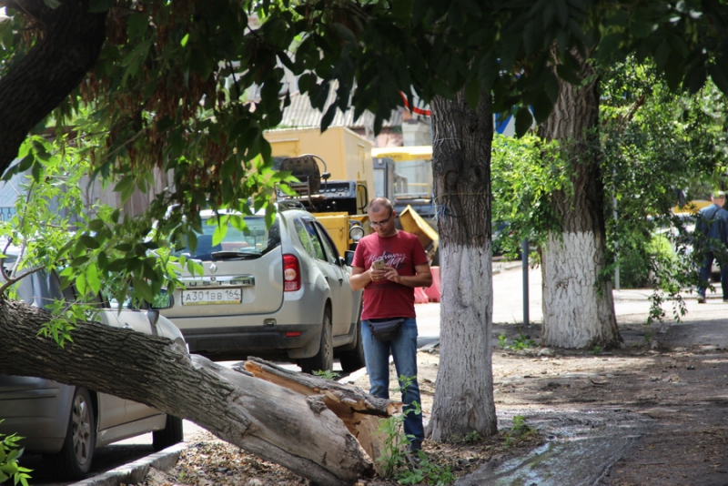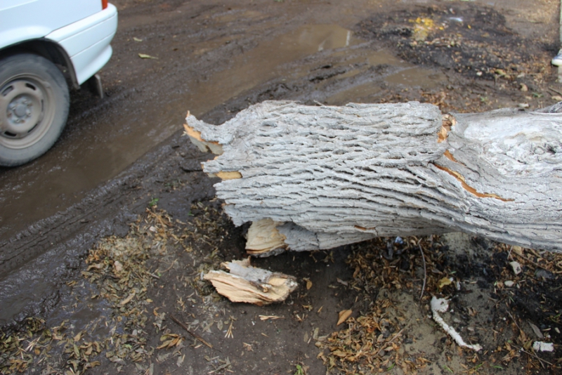 При этом ствол полностью перегородил проезжую часть. Предприимчивые автолюбители объезжают препятствие по тротуару, протискиваясь в тесное пространство между деревьями и домами.