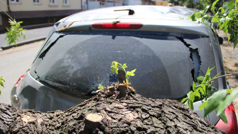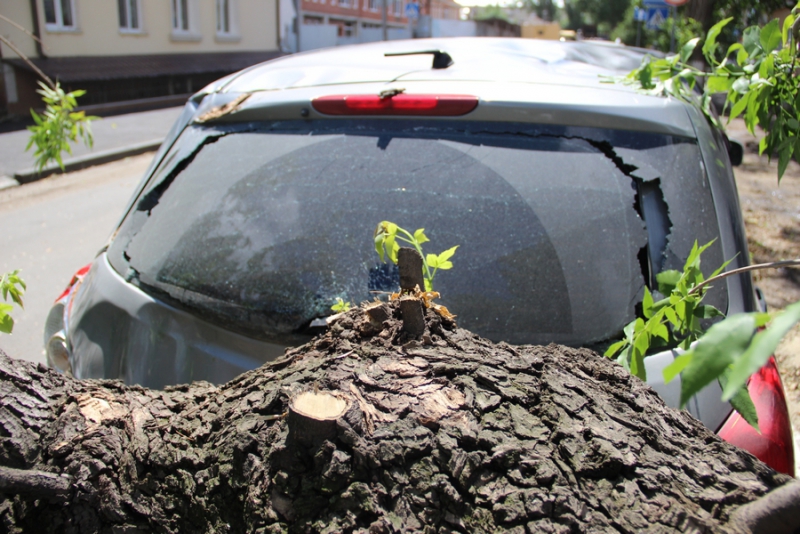 У автомобиля упавшее дерево помяло крышу, повредило заднюю дверь, фары, капот и бампер.