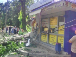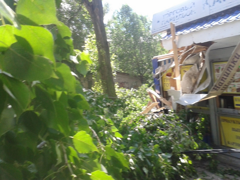 У магазина разрушена часть крыши – упавшее дерево снесло с нее часть профнастила, покалечило фасад и вывеску с ассортиментом товаров.