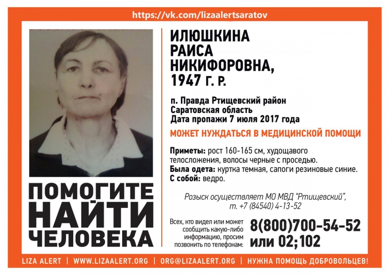Если кому-то что-либо известно о местонахождении Раисы Илюшкиной или имеется какая-то информация, просьба позвонить по телефонам: 8 (84540) 4-13-52 (МО МВД «Ртищевский»), 8 (800)700-54-52 («Лиза Алерт») или 02 (102 с сотового).