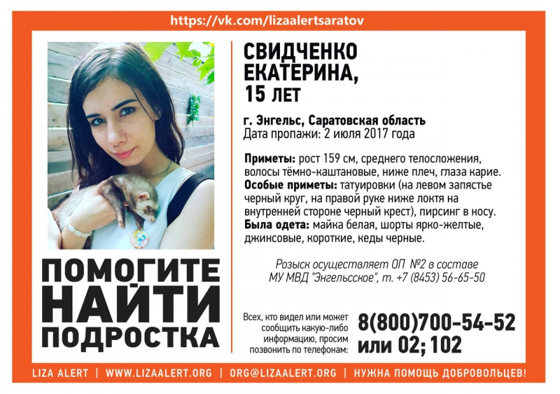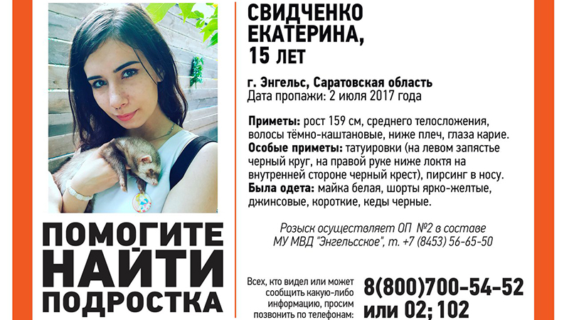 Если кому-то что-либо известно о местонахождении Екатерины Свидченко или имеется какая-то информация, просьба позвонить по телефонам: 8 (8453) 56-65-50 (отдел полиции №2 в Энгельсе), 8 (800)700-54-52 («Лиза Алерт») или 02 (102 с сотового).