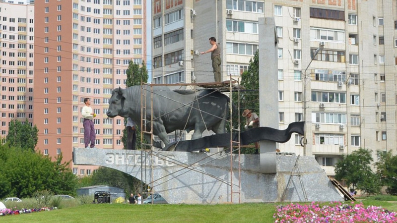 В Энгельсе Саратовской области вокруг символа города – скульптуры быка-солевоза – соорудили строительные леса. По статуе ходят рабочие. Таким образом, пояснили в районной администрации, готовятся к дню города.