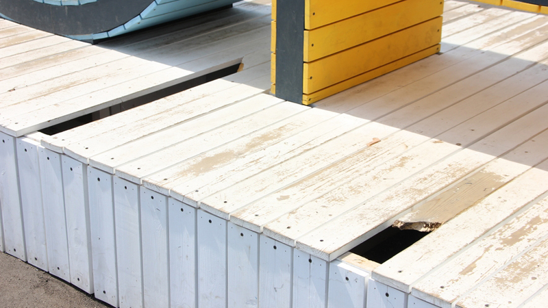 Две недели назад корреспондент «4В» обнаружил на помосте две сломанных доски, сейчас же у основания повреждены три дощечки, в дырки без труда может провалиться нога ребенка. В прошлый раз ответственные лица так и не устранили поломку конструкции. К тому же горожане быстро восполнили отсутствие рядом урны и начали кидать мусор в щели. Возможно, дощечки сломались из-за большого количества людей, которые стремятся залезть на арт-объект для красивого фото.